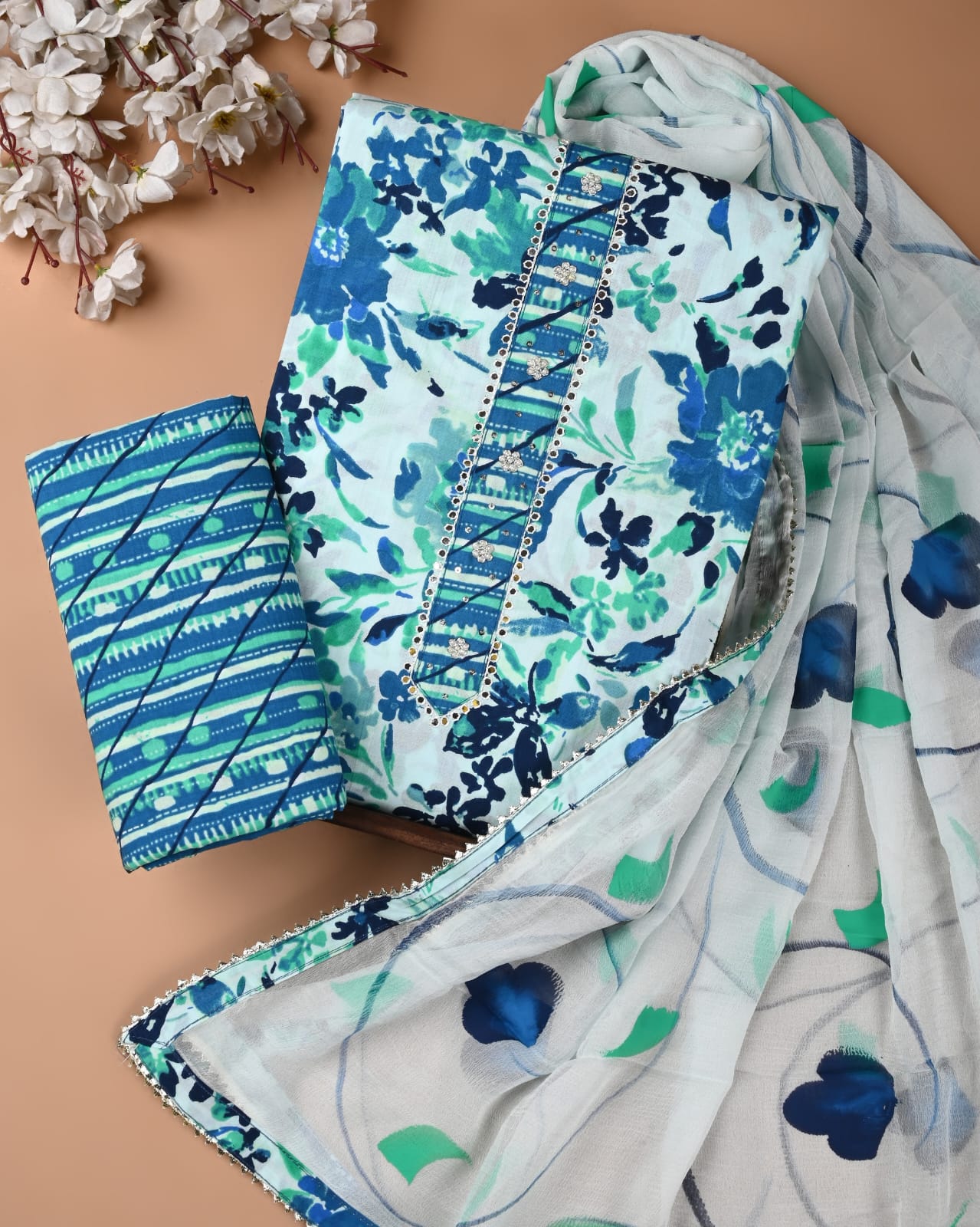 Immerse yourself in effortless elegance with this handcrafted cotton suit set, featuring a vibrant multicolor embroidered neckline highlighted with delicate zari gota patti work. Paired with a lightweight chiffon dupatta finished in zari lace, and a soft cotton bottom, this ensemble blends comfort with festive charm.