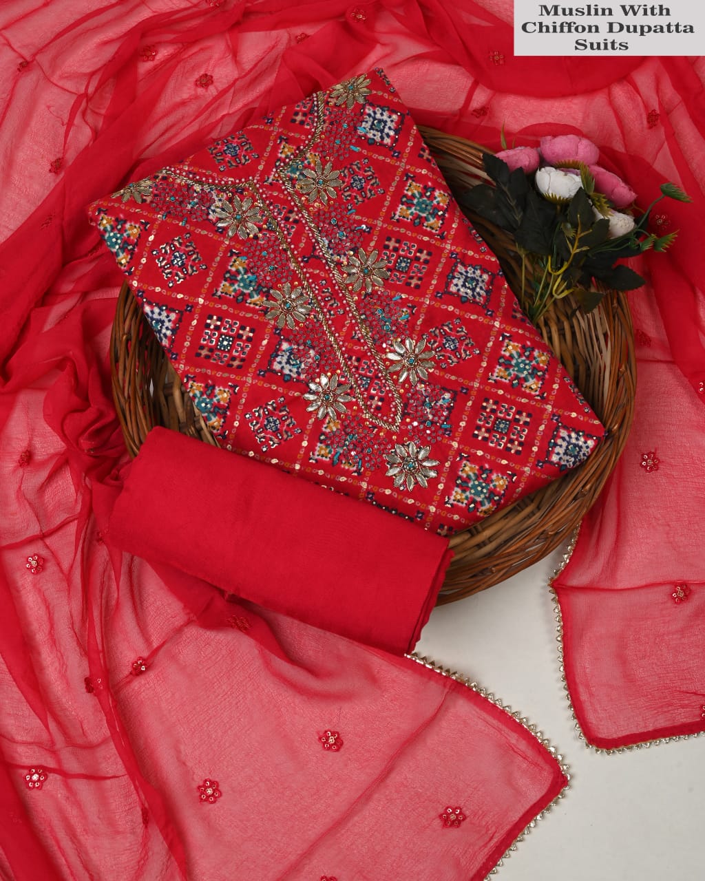 Premium Muslin Suit with Jardozi Neck & Chiffon/Modal Silk Dupatta (BCTMSCFG15)