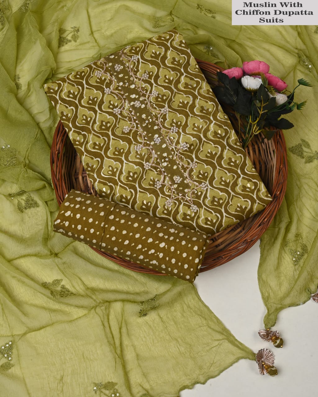 Premium Muslin Suit with Jardozi Neck & Chiffon/Modal Silk Dupatta (BCTMSCFG22)